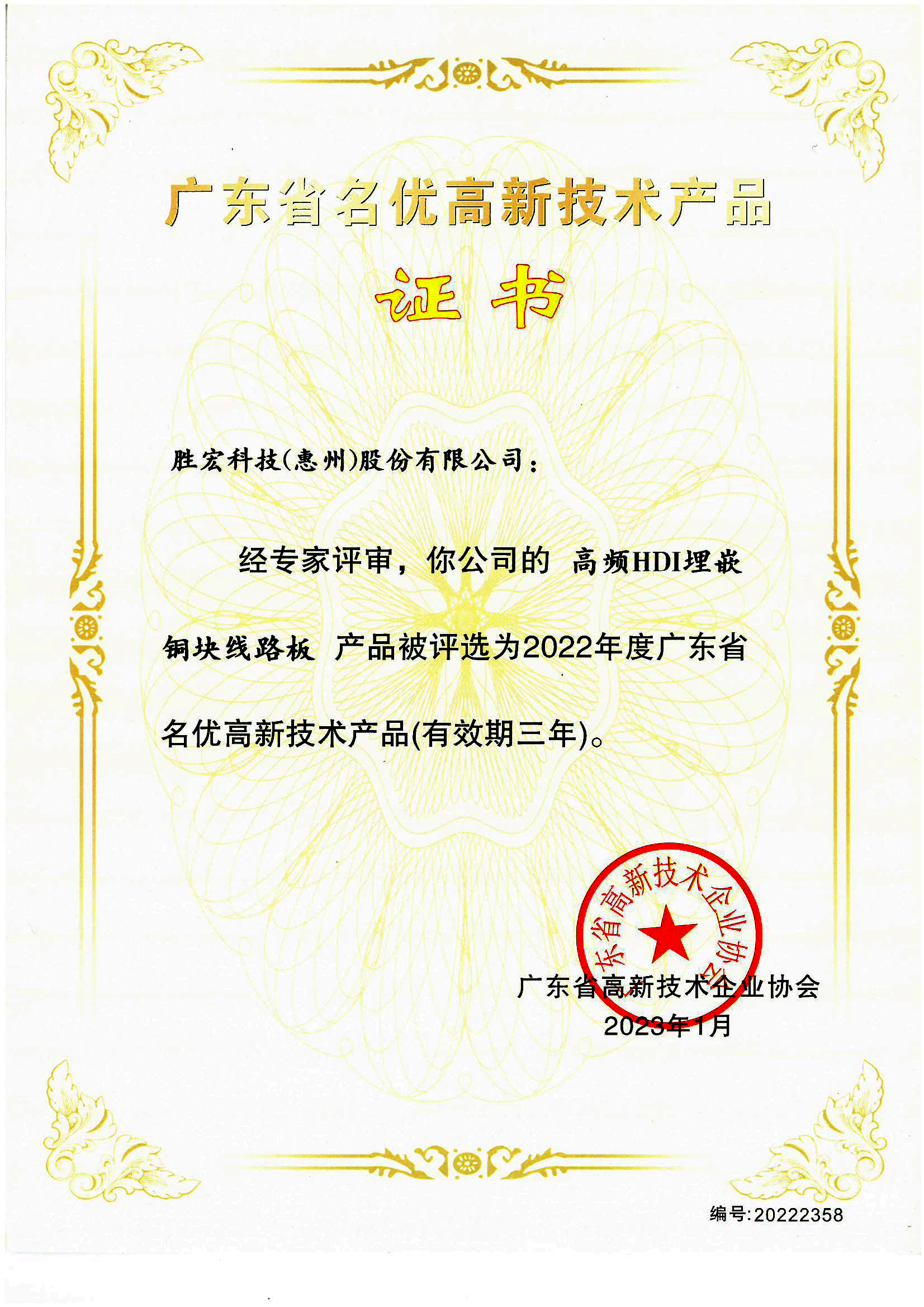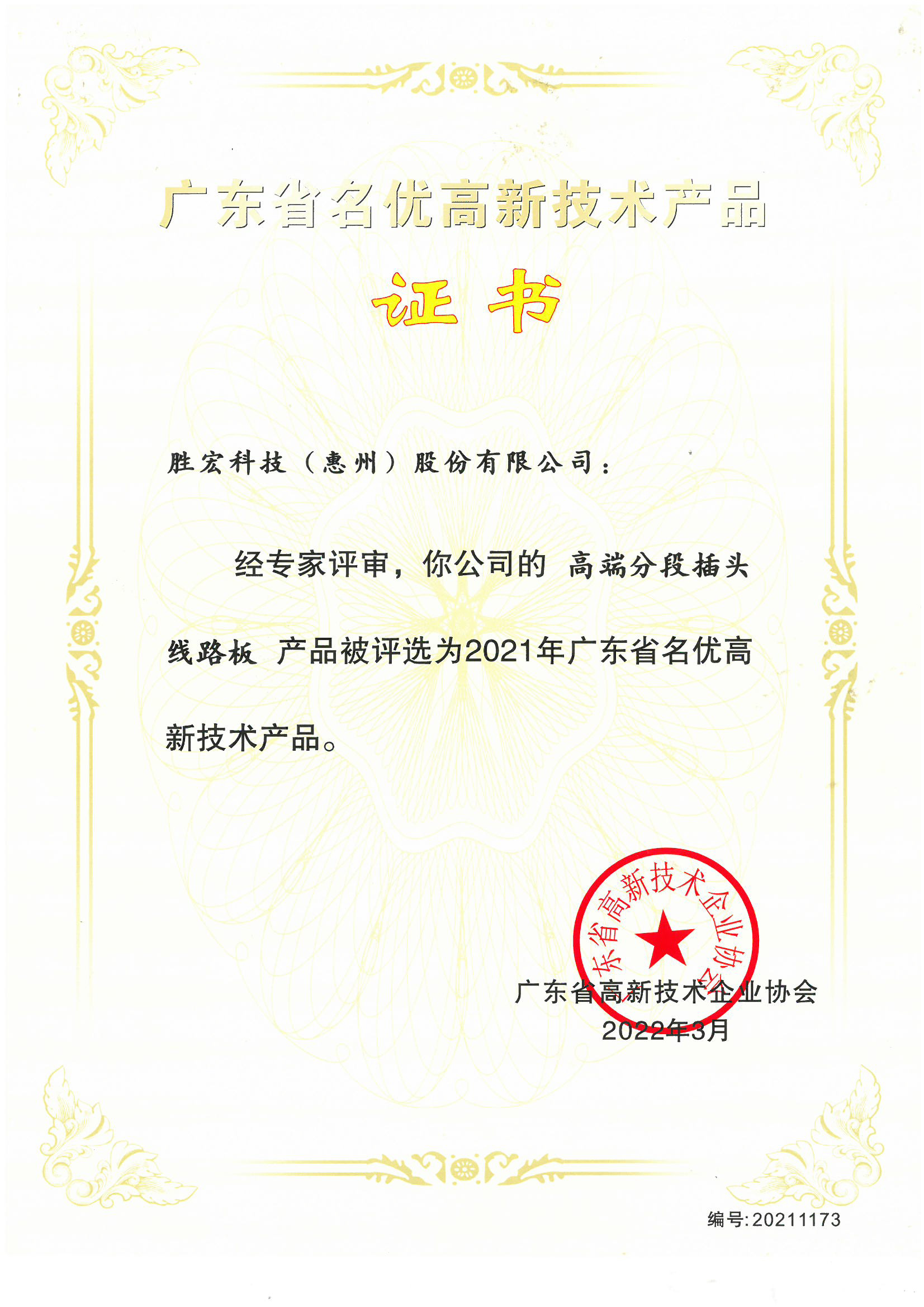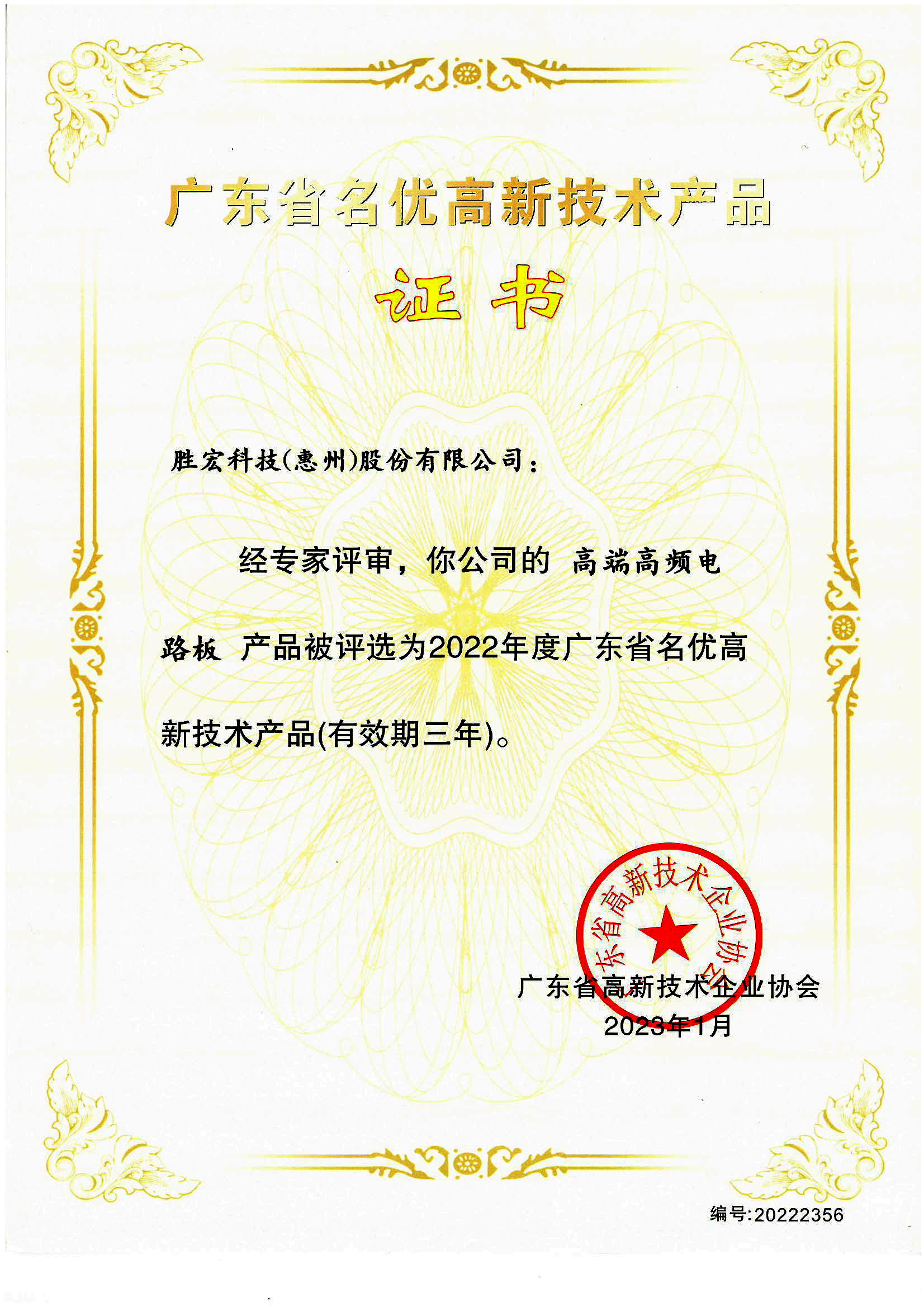 “高端高頻電路板”名優高新技術產品證書