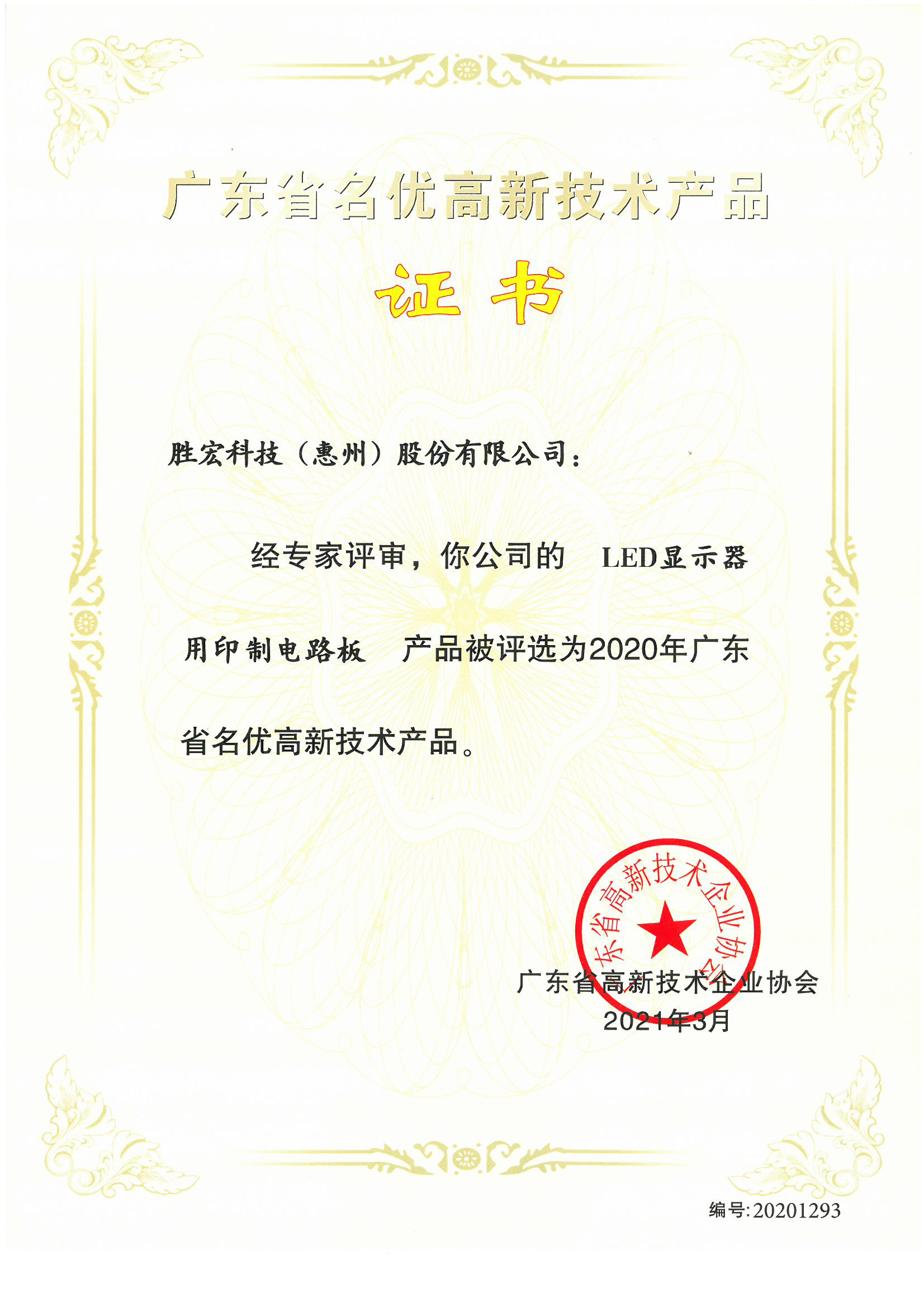 “LED顯示器用電路板”名優高新技術產品證書