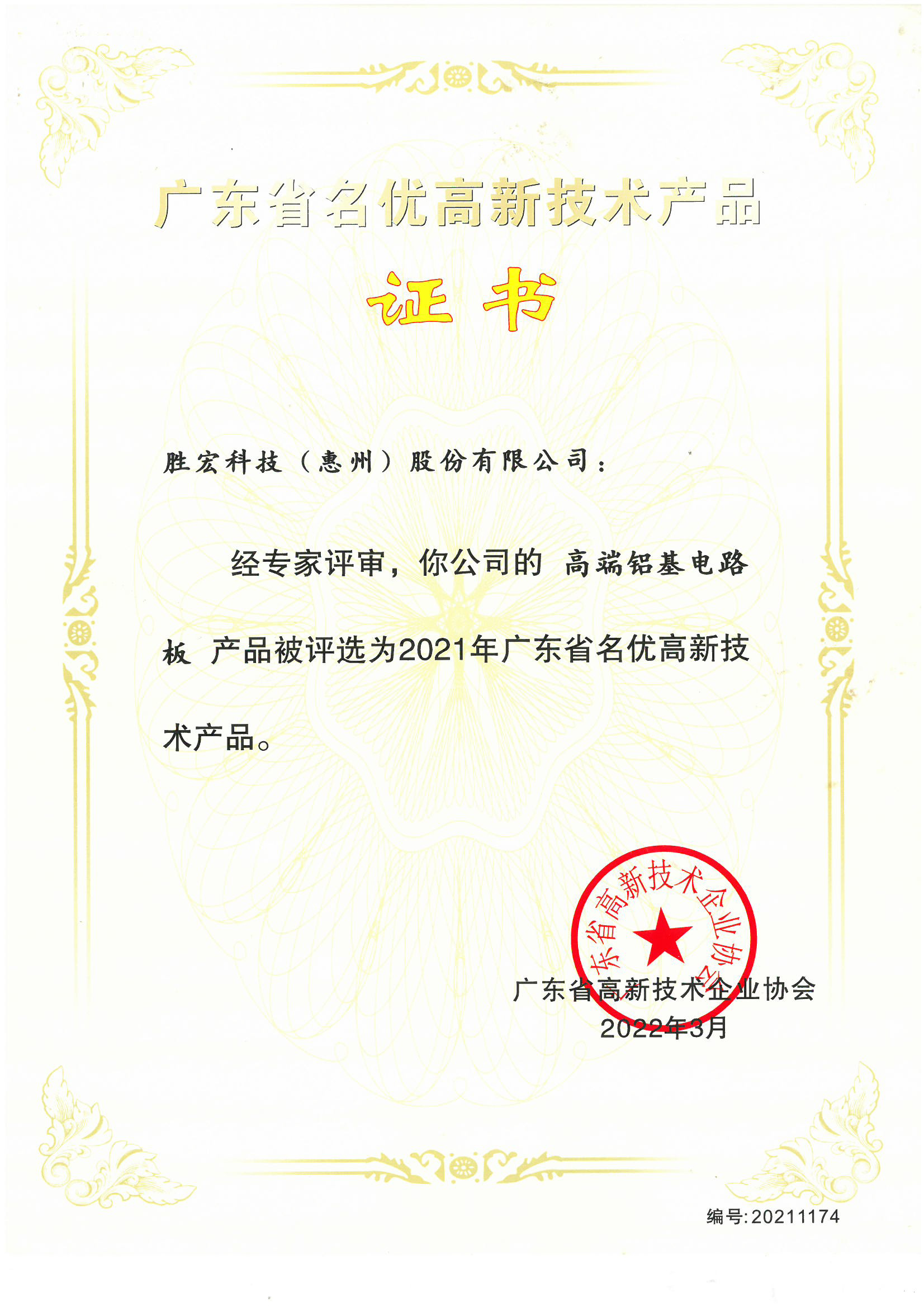 “高端鋁基電路板”名優高新技術產品證書