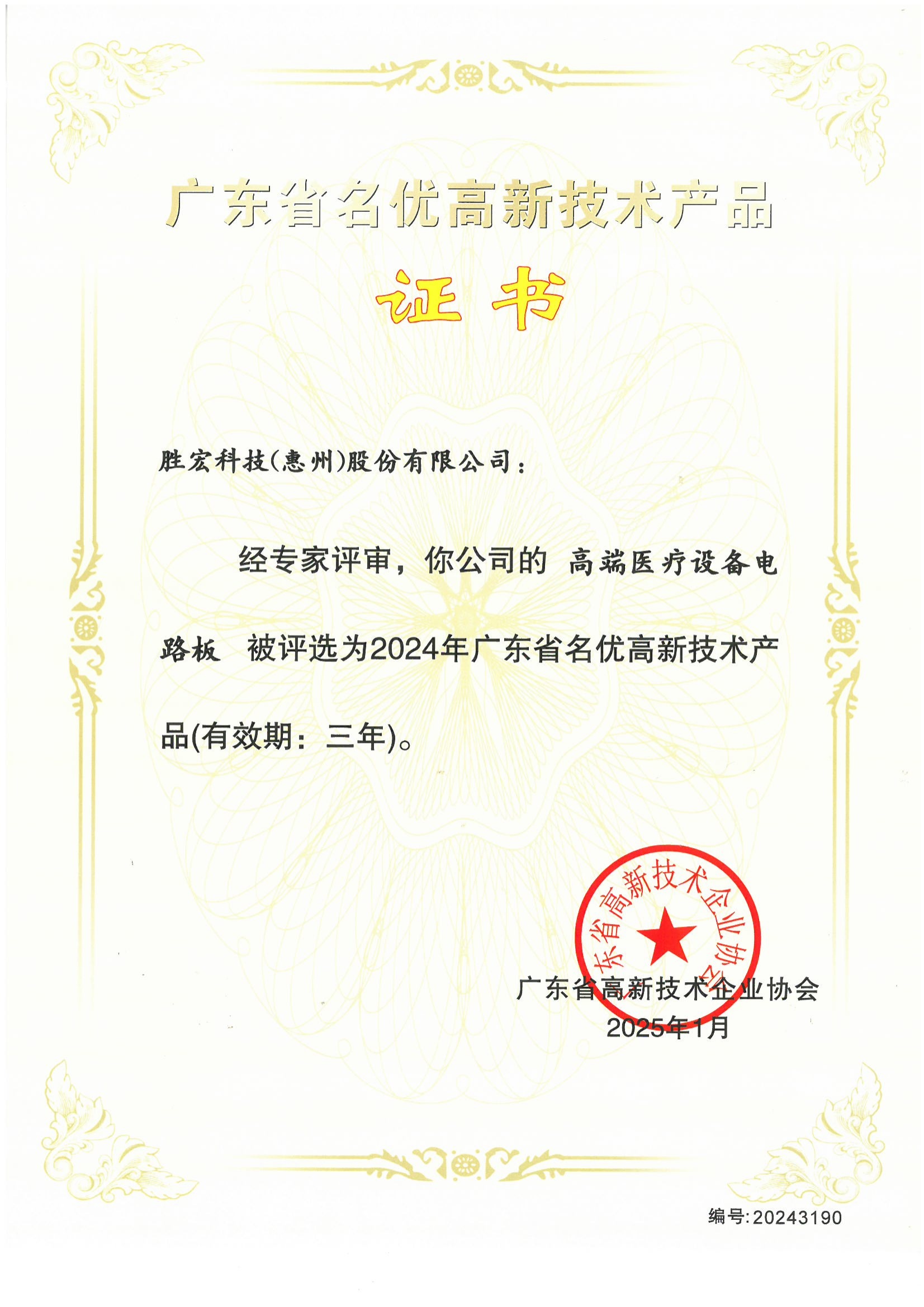 “高端醫療設備電路板”高新技術產品證書