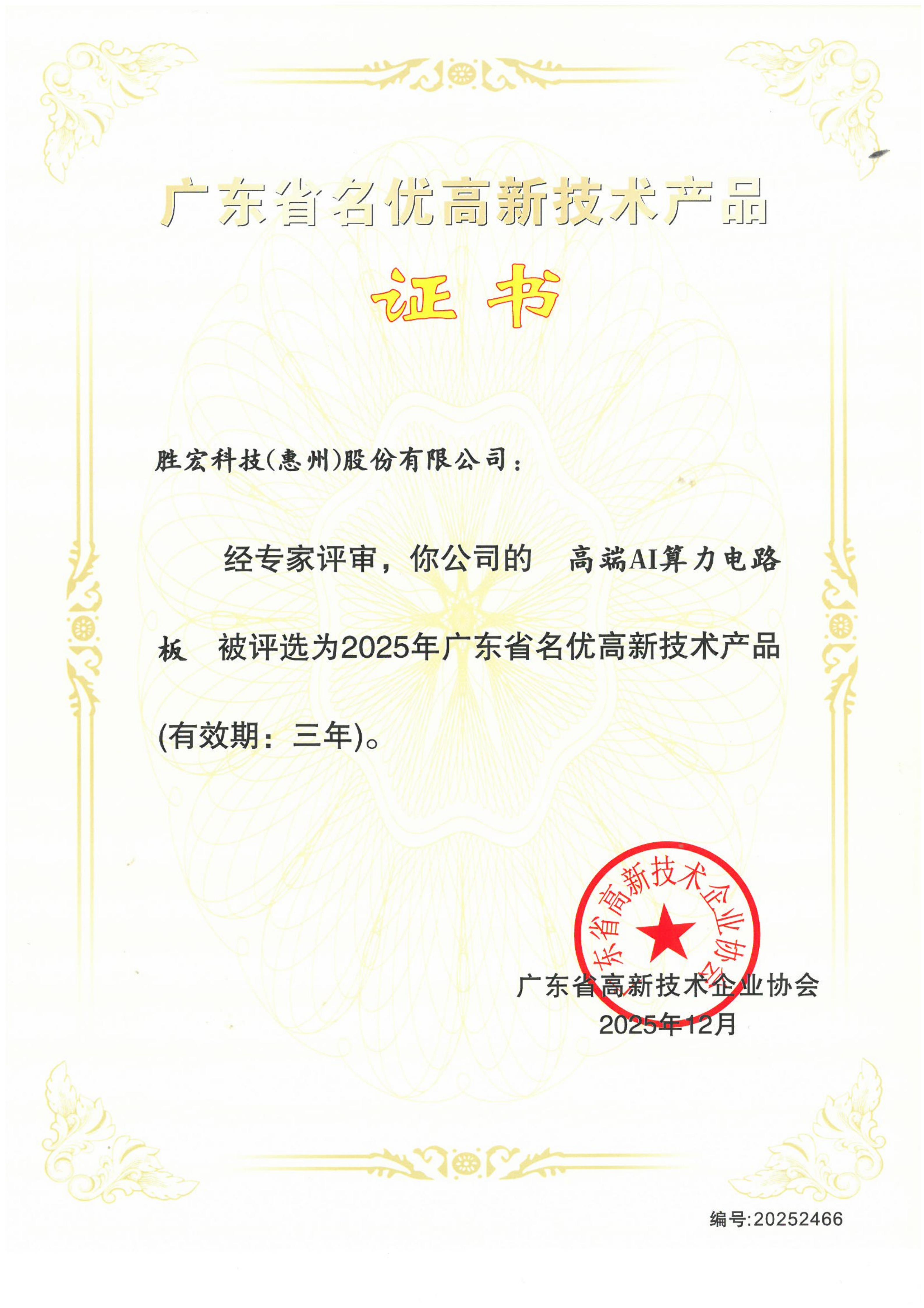 “高端AI算力電路板”高新技術產品證書